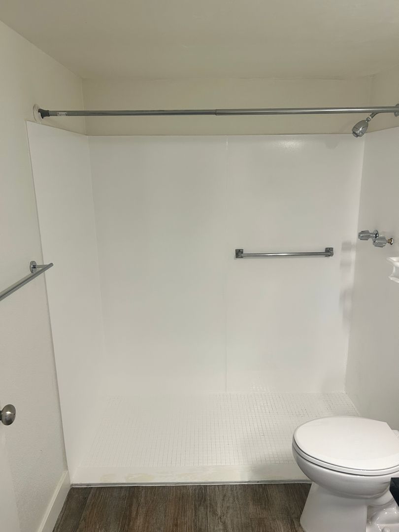 This floor plan has brand new cabinets, lighting, faucets, black quartz countertops, stainless steel refrigerator, stove, over the range microwave, garbage disposal, flooring & stackable washer/dryer. This floor plan has a spacious stand up shower.
