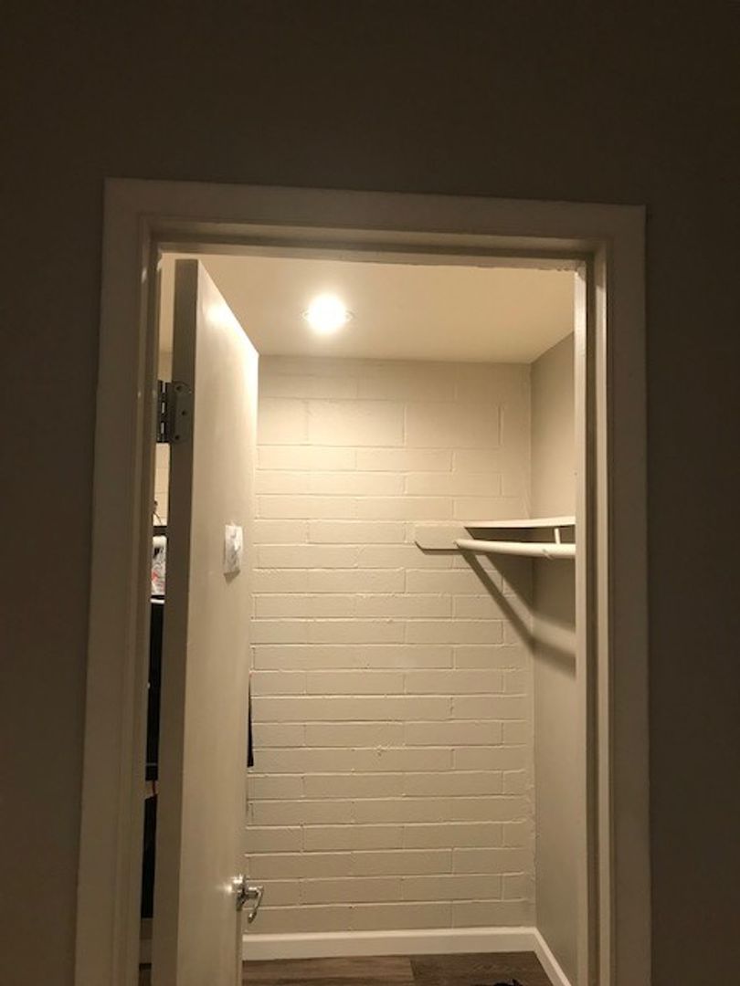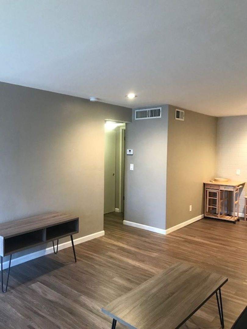 Step inside to discover 9-foot ceilings with sleek recessed lighting, creating a spacious and inviting atmosphere. The apartment features luxury vinyl plank flooring, quartz countertops, and modern cabinetry, offering a clean, contemporary aesthetic throughout. The generously sized walk-in closet provides plenty of storage, while the remodeled bathroom boasts high-end finishes and a fresh, modern look.